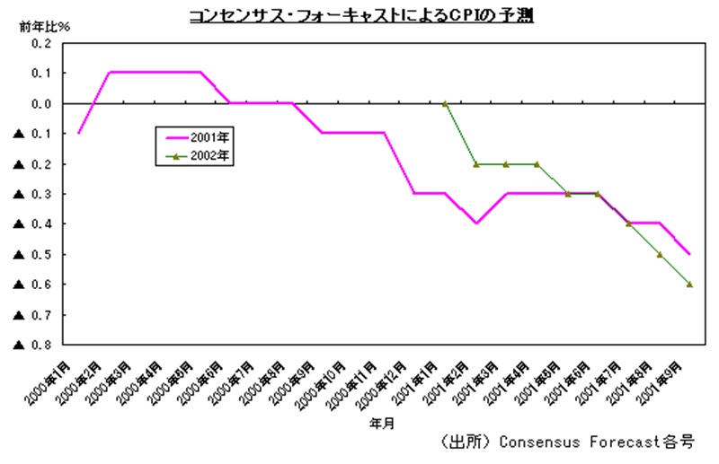 2000年末にかけて、ITブームおよび米国景気の失速が明らかとなり、その後、わが国においても製造業中心に急速な落ち込みが生じた。この間、非製造業部門は総体としては停滞を続けていたほか、財政政策も引締め気味に推移してきたこともあって、わが国景気の先行きに対する見方は急速に悪化した。このため、日本銀行は2001年に入り、2月に若干の金利引下げ後、3月には金融緩和策を大幅に拡充した。具体的には、金融政策の操作目標をコールレートから日銀当座預金残高に変更し、その目標を当初は5兆円に増やす(それ以前は平均的には約4兆円で推移)とともに、目標達成のために必要であれば長期国債の購入も増加させるというものであり、さらに、こうした政策を消費者物価指数の前年比上昇率がゼロを安定的に上回るまで続けるというコミットメントが加えられていた。