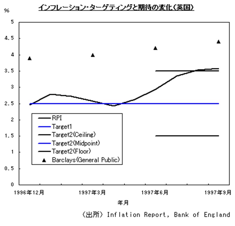 8同様の例は、1997年5月のイギリスの経験にも見られる。当時、イングランド銀行の金融政策運営の独立性をより高めるような意思決定がアナウンスされると、ほぼ瞬時的に物価インデックス債市場から計算されるインプライド・フォワードのインフレ率は特に4、5年より先のホライズンで大きく低下した。しかし、その前後の一般国民への期待インフレ率調査では、現実のインフレ率の足許の上昇に沿った形で期待インフレ率の上昇が確認されている。(図6参照)