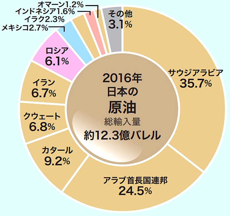日本の石油(原油)の約95%は中東地域から輸入されており、アラブ首長国連邦(UAE)やサウジアラビアが主たる調達先 資源エネルギー庁。近年はエネルギー安全保障の観点から、アメリカ、カナダ、中央アジア、南米などへの調達先分散(脱・中東依存)が進められている。