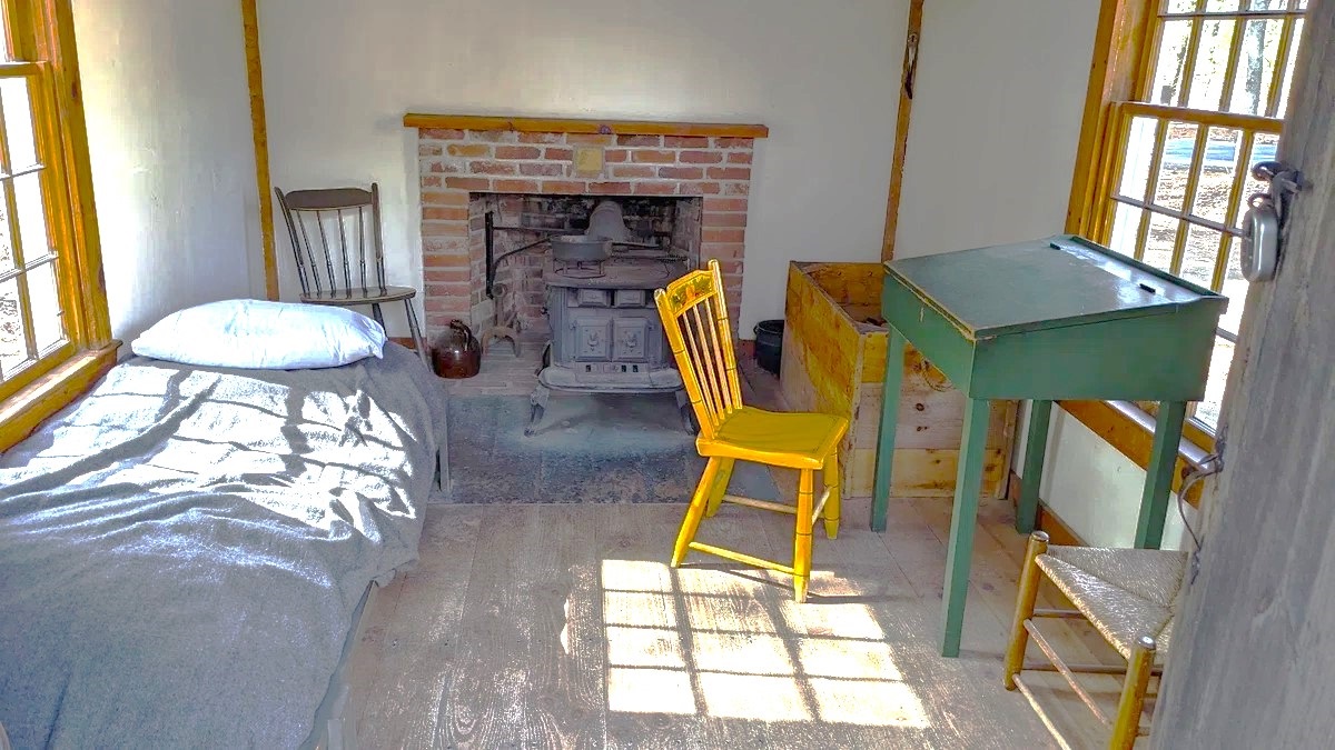 外目には暖炉の様相であるが薪をくべる部分に鋳物製の薪ストーブが設置されていて暖炉の煙突は薪ストーブの煙突として使われたことになる。一人用のベッドと机一つ、椅子三脚が見える。