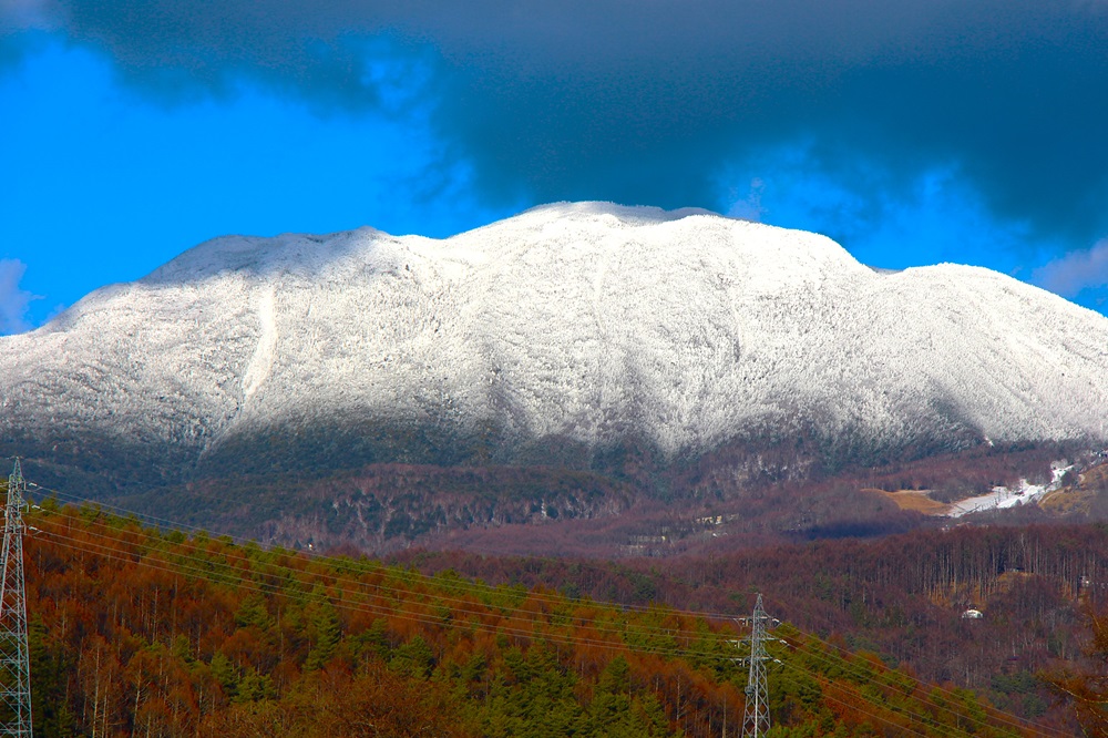 晴れたこの日の東の空は梢の上に青く、その先に北横岳(2,480m)が白く大きく羽を広げる。