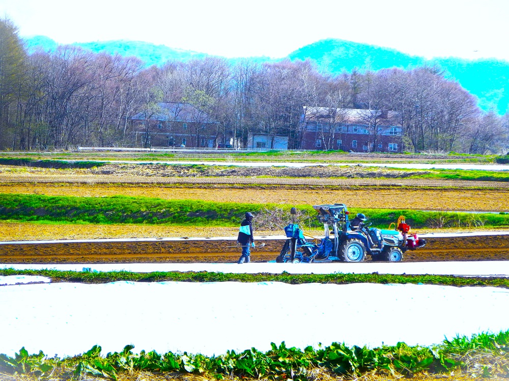 長野県南佐久郡南牧村の高原のレタス農園のサクラが咲くころの農作業 4月20日午後に撮影
