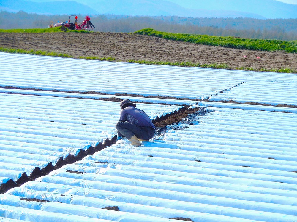 長野県南佐久郡南牧村の高原のレタス農園の春の作業 働くのはインドネシアの若者 4月20日午後に撮影