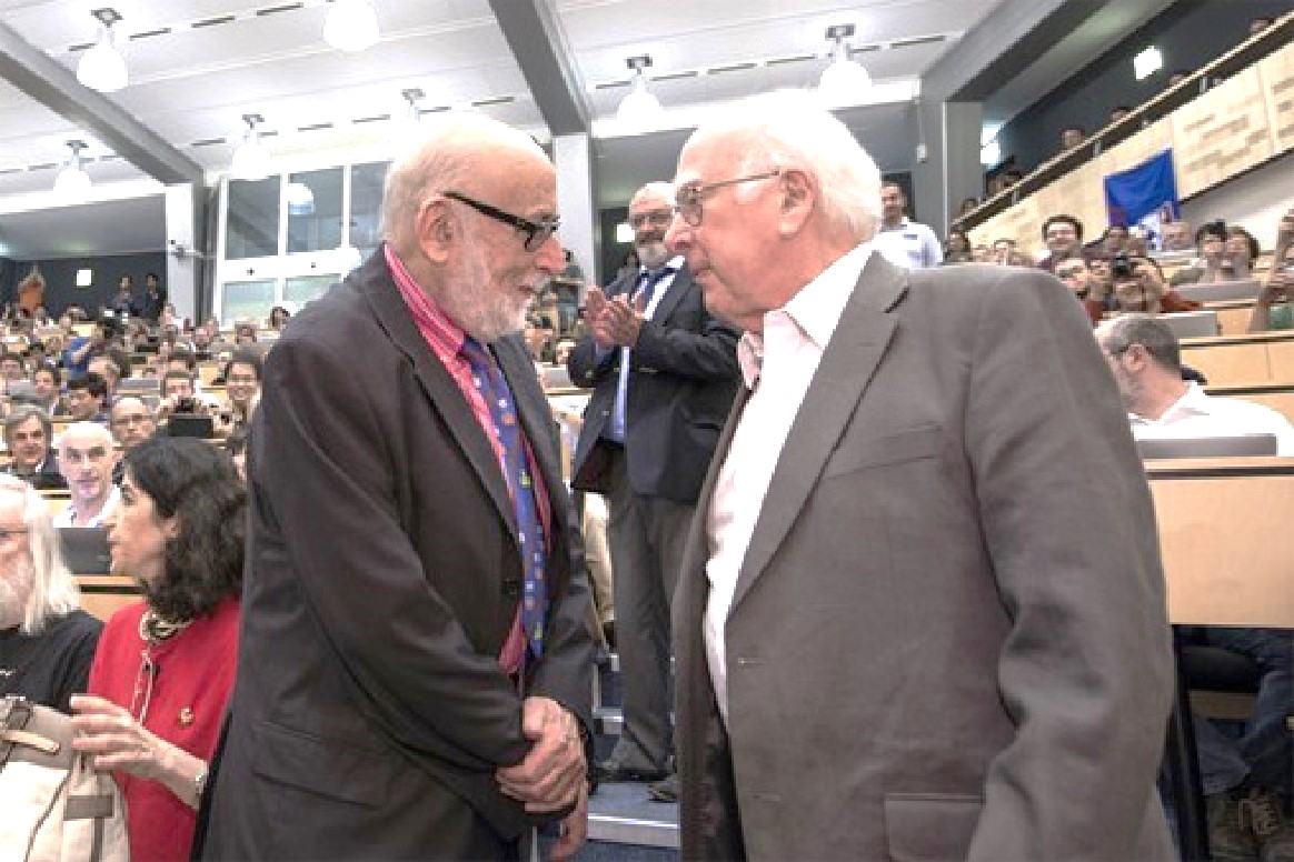 ヒッグス博士(右)とアングレール博士 ©CERN