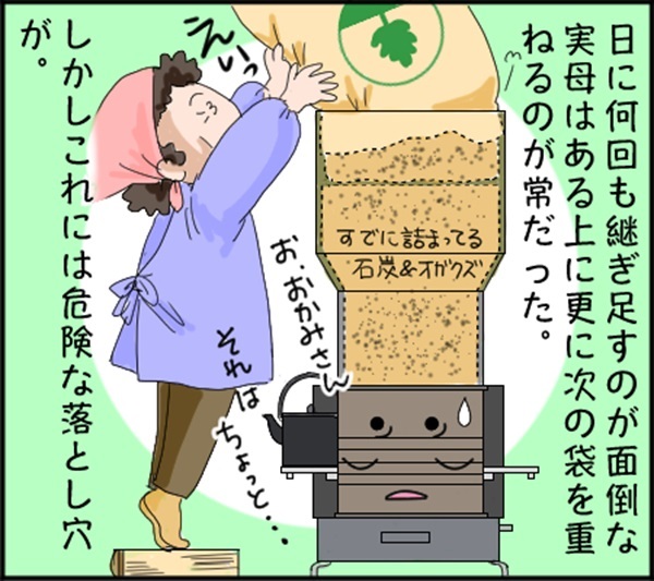 ルンペンストーブといわれるタイプは貯炭部の最上部から線香のように下に向かって燃え移って行く方式です。