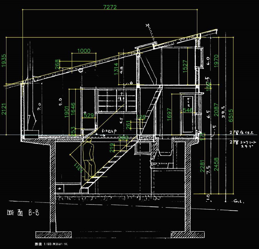 居間の一番低い天井が2121となっています。3階の低いところは1290で、ここが屋根裏部屋で、製図室です。こんな狭い部屋も『鳥になったような暮らしのできる家』※3に懸かっているのでしょうか。限界極小寸法に挑戦していることは確かに思われます。※3よりもっとすごいのは階段を登るとき頭をぶつける高さになっています。設計の限界寸法は1800は無いとだめと言われています。それを遙かに小さい設定です。おまけに頭よけのために斜めに切りかかれており、そのため寝室への入り口が250上がらなければならないことになっています。茶室のような限界寸法と言うことなのでしょうか。