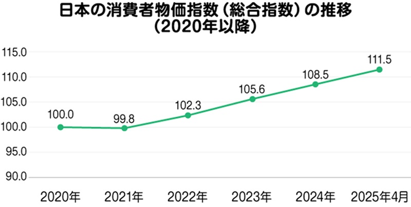 総務省が2025年5月に発表した消費者物価指数(2020年基準)によると、2025年4月の日本の物価(総合)は2020年の物価を100とすると111.5という状況です。これを金額に置き換えて考えると、2020年に1,000円で買えていたものが2025年4月時点では1,115円、1万円だったものなら1万1,150円に物価が上がった計算になります。