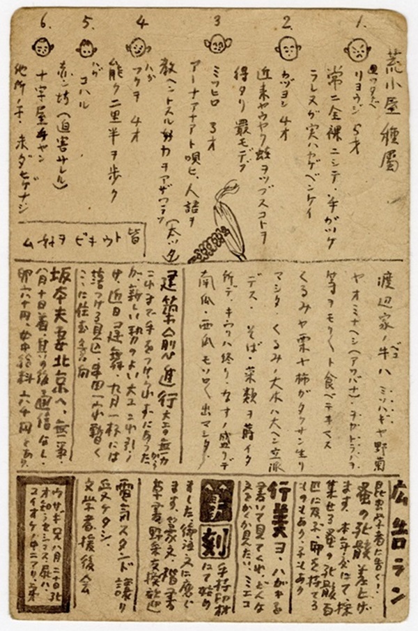 戦時中に疎開先から親に宛てたハガキにも「荒小屋週報」(荒小屋は疎開していた山形県新庄の村の名前)というタイトルが付いていて、下には新聞みたいに「広告ラン」があって、「昆虫学者に告ぐ! 蚤の死骸差上げます。本年度にて採集せる蚤の死骸百匹におよぶ、卵を持てるものもあり、子もあり」とか書いてある。おもしろい。