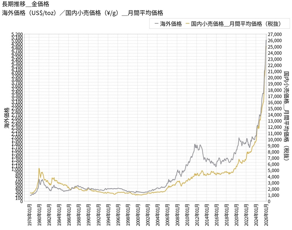 長期金価格の推移(1978年1月から2026年1月)。黒線は海外価格、金色は国内価格(いずれも月平均価格)(出所:三菱マテリアル株式会社)