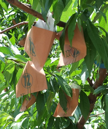 袋かけした桃の実。虫除け病気除けなどのために行う。
