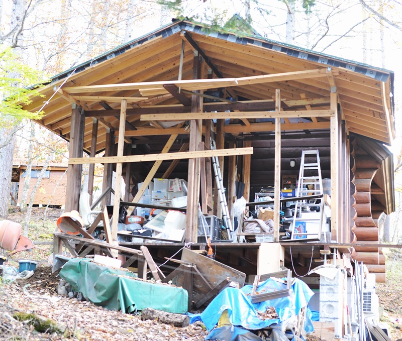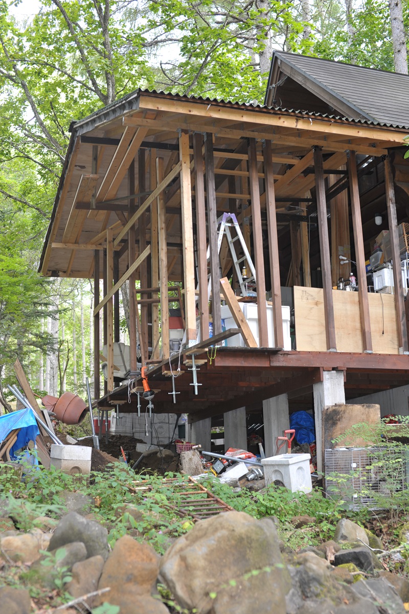 西側の開口部は高さ2mほど。ここに二つのドアを付けて荷物の出し入れをする。旧デッキの支柱(右端)と新たに建設した二つの支柱。