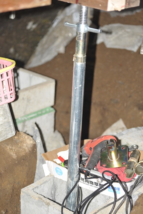 支柱を建てて足場調整用の金具のネジの部分を回転させると部屋の底部の角材がストレスなく持ち上がる。強度の確保と作業性に不安があったがネジ部分の取っ手を回すと素直に持ち上がる。ググッ、ググッと基礎の角材が上がっていくのは感動もの。やったね、という気持ち。