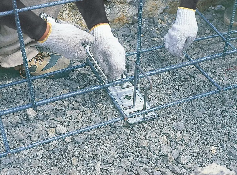 桝の内部から立ち上がる単管パイプの下部には上下調整機能が付かない金具を取り付けて、単管パイプの切り口を塞ぐようにして体面積を広げる。その金具の下にはモルタルを流し込み同時に桝の内部空間をコンクリートで固める。同コンクリートは積みました桝の上部まで流し込む。ここには鉄筋と金網を入れて補強材とする。