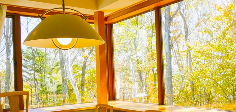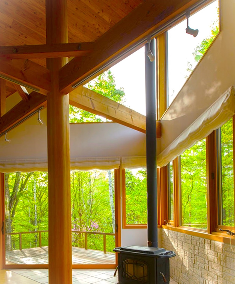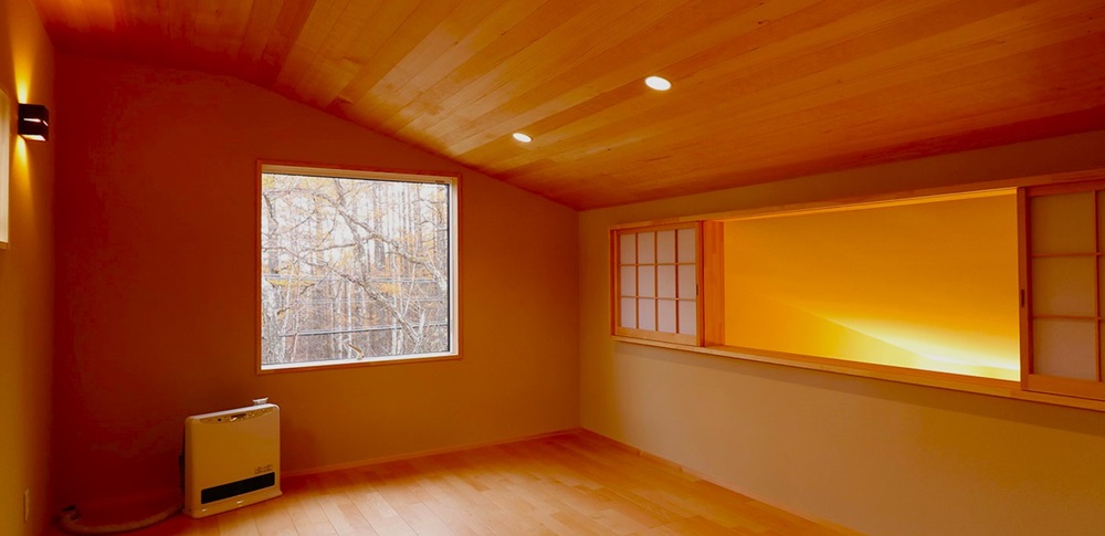 各部屋ごとに窓を取り付けた。西の大窓は一段の窓、北と東は二段構成の窓にした。西の部屋は外からの目線が遮られているので素通しのガラス、東の部屋には擦りガラスを用い、朝日がそのまま差し込んでも眩しくない位置の東の上部の窓には透明ガラスを取り付ける。朝になるとその日を祝福するように陽がベッドの上を光芒が射す。腰窓は擦りガラスだ。通りからの視線が気になるベッドルームであるから。北側の二段の窓も擦りガラスだ。部屋に落ち着きを与えようということからの採用。冬場にはミズナラ、シラカバ、カラマツほかの落葉樹が葉を落とすから通りからの視線が気になる。散歩する人は人が住んでいる方面に視線を投げるからだ。