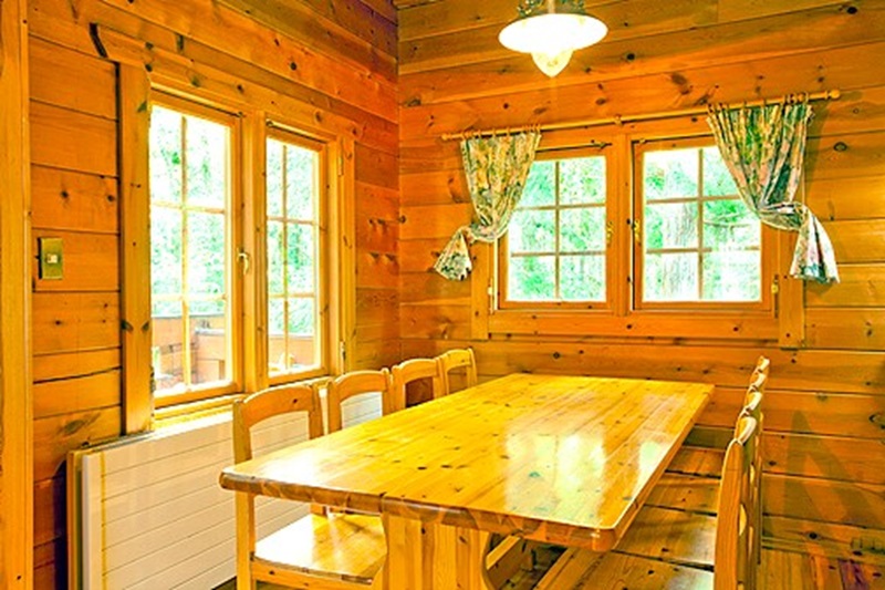 厨房設備、風呂とトイレなどは母屋のを使うから追加した小屋はそのまま居室として使える効率の良さがある。当初は私だけが使う「森の喫茶室」(珈琲ルーム)と呼んでいたが、腰板を回して囲うと中央部を境として二室が出来あがっていることを知る。北側を共有していて東と西に分割する格好になる。西は夕日が沈む方角であり、東は朝日が差し込む。冬至のころには午前8時に落葉樹の真横から透かすように日が差し込むのが東側の部屋。午後4時過ぎには西の部屋の向こう側の林の上空を夕焼けが赤く染めて部屋に日が差し込む。北側にはシラビソの木が林を形成していてクリスマスツリーと同じ姿で綿帽子を被る。東側のシラビソは三本ほどで冬枯れた高原に緑の色を残す。国土地理院の地形図の1,600mの等高線が北から南に引かれる庭である。ここで珈琲を飲んで寛ぎ、夕日を浴びて一日を終わろうという企てによって建設を進行させているのが「森の喫茶室」(珈琲ルーム)である。「森の喫茶室」(珈琲ルーム)または「森のキャビン」であり、大きなガラス窓の向こうに沈む夕日とクリスマスツリーをみることができる「森の喫茶室」と東側の「ゲストルーム」の二室で構成される。