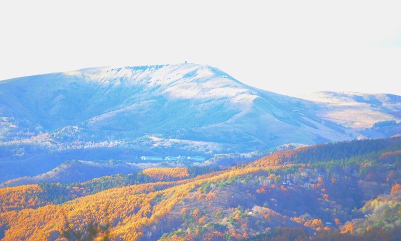 八ヶ岳連峰の最北端に位置する蓼科山(標高2,531m)。北八ヶ岳のカテゴリーに入るのか、蓼科山として独立して存在するのか説明が難しい。敷地東の駐車場入り口付近から2025年11月10日14:20撮影。秋になって葉が落ちると姿を現す。建設中の喫茶室からは北面に生える常緑樹のシラビソの林の陰になる。大雪が降り蓼科山が白銀に輝くと林越しに気配を強める。