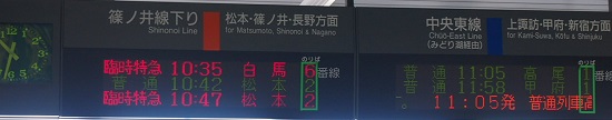 土曜日の朝になった。塩尻駅上り下りの列車をみる、どれに乗ろうか乗ろうか。