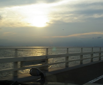 アクアラインの夕景。東京に向かう。左が東京湾の入り口方面。