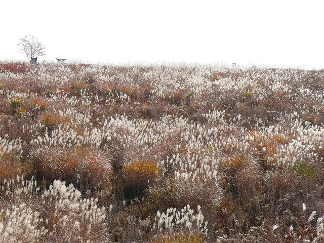 ススキで一瞬白く輝いた高原はこのススキが霜と強風で穂をもぎ取られたあとは薄茶けたまだら模様の寂しい景色となって雪の来るのを待つ。