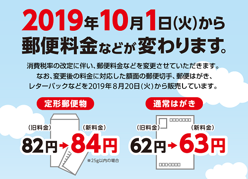 郵便、ゆうパックなどの新料金。消費税率の改定に伴い、2019年10月1日(火)から郵便料金などを変更させていただきます。
