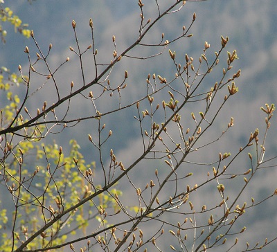 奥飛騨の新芽の背景は北アルプス穂高連峰の山肌であった