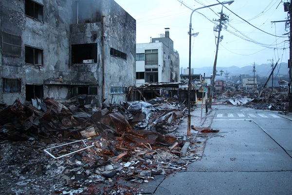 輪島市の朝市が開かれている地域は地震に伴う火事によって消失した。地震と火事そして津波、山崩れ、地割れの一つとしての液状化によって家屋が損失、令和6年能登半島地震においては死者 240人がでた。行くへ不明者10名は集計に含まれていない。2024年1月20日、16:53撮影。