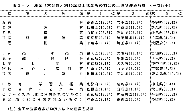 産業大分類別の15歳以上就業者の割合を都道府県別にみると,「卸売・小売業」は福岡県が20.6%,「製造業」は滋賀県が26.5%,「サービス業(他に分類されないもの)」は東京都が18.3%と最も高く,平成12年からの増加率が最も高かった「医療,福祉」は長崎県が12.8%と最も高くなっている。また,「情報通信業」は東京都が6.8%と最も高く,次いで神奈川県が5.9%,千葉県が4.3%,埼玉県が4.0%と首都圏の一都三県のみが全国平均(2.7%)を上回っている。(表3-5)